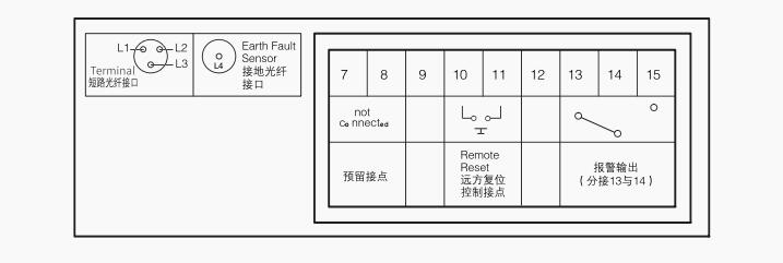 在安裝過程中,主機接收部位的光敏管可能感光,導致面板上的指示燈閃亮,此時需將指示器進行手動復位。復位辦法:按住面板上的“復位/檢測”按鈕2秒鐘以上,所有指示燈開如閃亮即可。在主機背面可見一圓形三孔栓(L1、L2、L3)與一個單孔栓,及用以檢測故障的電流傳感器數據輸出信號與主機連接的接口。具體安裝辦法如下:
