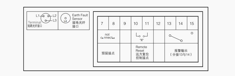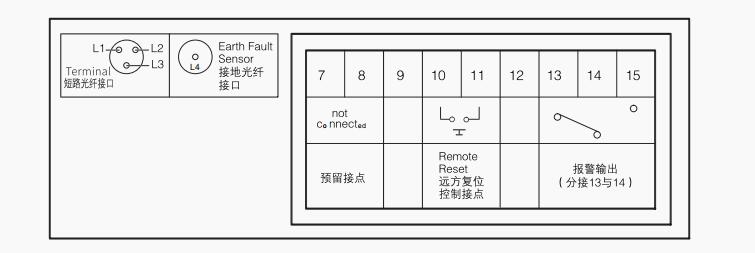 3.如果13、14、15接線端沒有接收故障信號時,面板對應的指示燈不閃爍,標貼13與15對應的接線端通過主機內部繼電器相連通,13與14之間斷開。